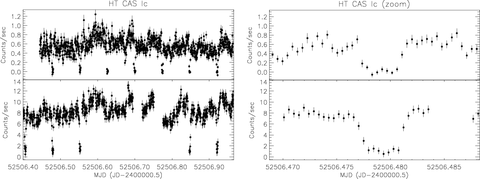 When comparing the X-ray ingress/egress phases in HT Cas (Table 1) with those derived in optical (see Table 5 in Horne et al. 1991), it is clear that the geometry described above may be applied, and polar accretion may be invoked to explain our X-ray light curve (keeping measurement uncertainties in mind). In this respect, we also note that the OM data provides a description of the optical light curve consistent with that found in the literature but, of course, deeper and longer observation possibly covering more cycles are required to differentiate between the two scenarios described above.