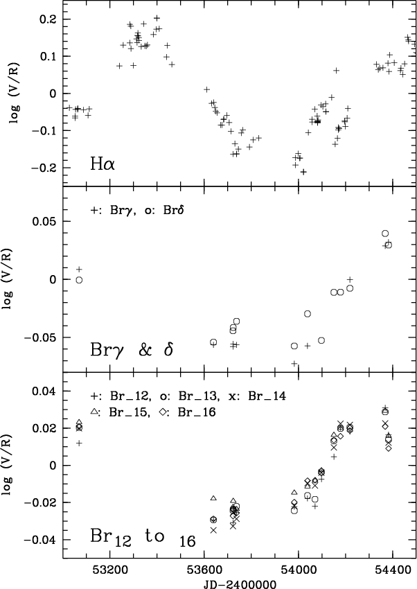 Purely circular Keplerian disks are also unable to explain the complex variability of the Balmer emission lines, notably the so-called V/R (the violet-to-red flux ratio of the emission peaks) variations. Most observations of V/R variations concern lower Balmer lines, but they can also be seen in virtually all other emission lines. Often, V/R variations are cyclic with timescales of 5-10 years (Okazaki 1991). The amplitudes can be large to spectacular. Nevertheless, many V/R cycles look strongly perturbed because of concomitant large variations in the emission-line strength relative to the continuum and, presumably, the unsteady character of the mass loss from the central star.