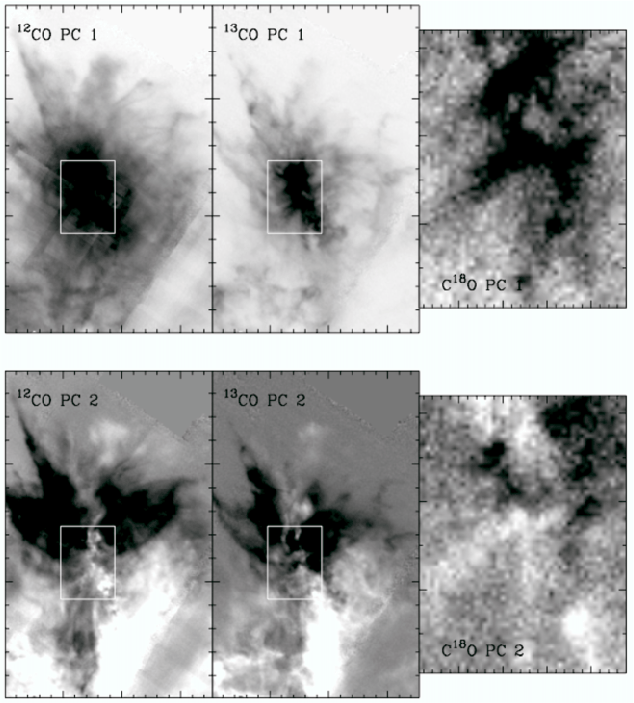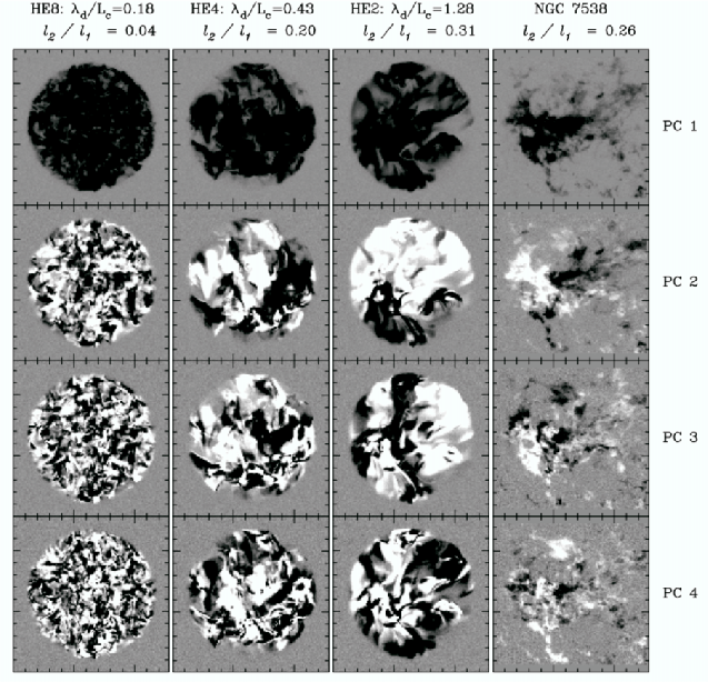 PCA can be used to decompose three dimensional spectral line imaging observations onto orthogonal spectroscopic eigenvectors along which ordered sources of variance in the data are maximized (Heyer & Schloerb 1997). Projection of the data onto the eigenvectors produces a sequence of diagnostic eigenimages. We refer below to each coupled eigenvector-eigenimage pair as a principal component (PC), distinguished by its order m = 1,2,..,N, where N is the number of spectroscopic channels of the data set. The amount of variance in the data accounted for by the PCs is a decreasing function of m. The characteristic sizes of eigenimage structures are measured as the spatial scale at which their autocorrelation function (ACF) falls to 1/e of the zero-lag value (Brunt & Heyer 2002a). At order m we denote the characteristic spatial scale of the eigenimage as lm.In the literature there are numerous examples of eigenimages obtained from simple molecular cloud models and from observations of real molecular clouds (e.g. Heyer & Schloerb 1997; Brunt 1999; Brunt 2002b). Real molecular cloud eigenimage sequences display chaotic structures that are only replicated by models that contain chaotic (turbulent) velocity fluctuations on all scales. A quantitative statement on this was given in Paper I, as summarized below.
