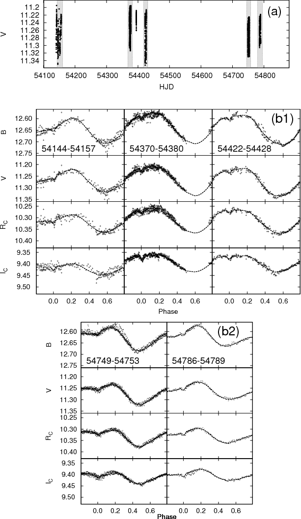 Figure 2: a) Light curve in V passband. The scale is smaller than the actual changes of the star caused by a flare at the beginning of the observation. b1,b2) Four-colour light curves of V405 And, and the fitted light curve solution containing both binarity and spottedness. The phased light curves contain observations from Julian date intervals shown on the plots. |