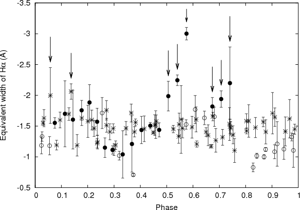 line was observed from the beginning of the observations. The flare eruption started at phase 0.51, reached its maximum at phase 0.58, and lasted for more than 2.5 h, at least until the end of the observations. At the time of the flare H