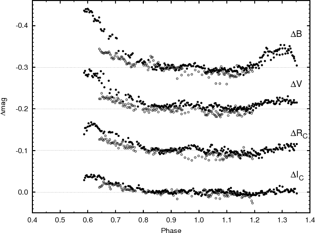 Figure 5: Light curve observed on 2007 September 29-30 at Piszkésteto. The binary and spot model is removed from the observed light curves. Dashed lines show zero level for each passband. Data from the 29 and 30 September are plotted with empty and full circles, respectively. |
