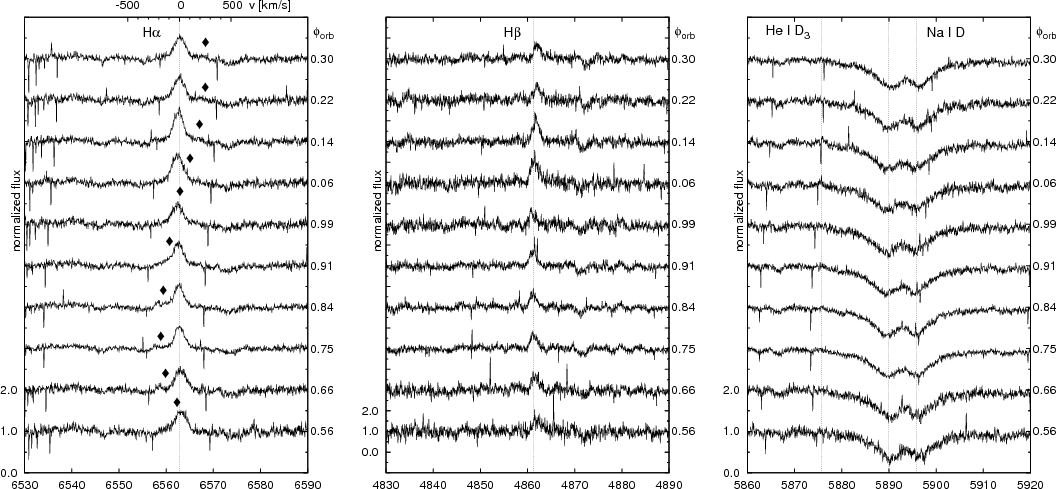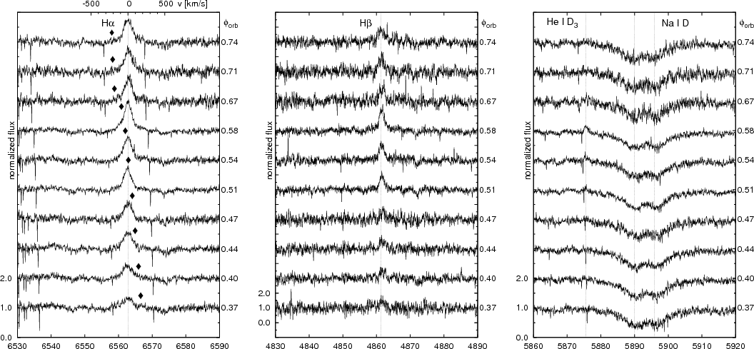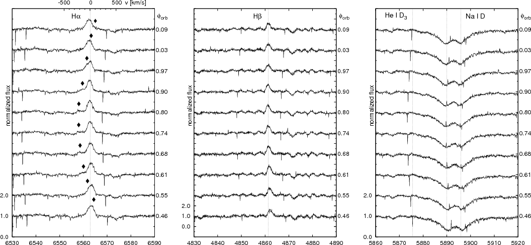 is also increased, and asymmetry is seen in the red wing at all phases (Fig. 9 middle panel). As the indicator of the explosive event, He I D3 appears as a prominent emission line (Fig. 9, right panel) at phases 0.54-0.58. A very similar event is reported on LO Peg by Eibe et al. (1999).