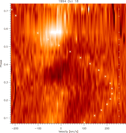 Altogether, 97 high-resolution spectra were retrieved from the ELODIE archive at the Observatoire de Haute-Provence (OHP) (Moultaka et al. 2004). In 1994, 38 spectra were observed: 27 between October 18-23 and 11 between December 12-16. Another 59 unpublished spectra were obtained between October 25-30, 1998. The spectra from the archive cover the wavelength range of 4000-6800 Å with a resolution (