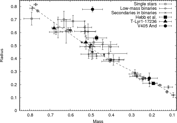 which has been suggested as the limit of full convection, fit the mass-radius relation well. Among these low-mass stars are the secondary components of the binary from NGC 1647 and of V405 And. However, the correlation gets looser with increasing mass. In Fig. 13 there are three systems in which the masses of the components are very different: T-Lyr1-17236, the binary from NGC 1647 (Hebb et al. 2006), and V405 And. T-Lyr1-17236 rotates rather slowly with a period of