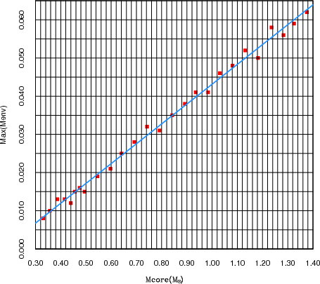The maximum envelope masses for different core masses in our hot subdwarf models (squares). The solid line is