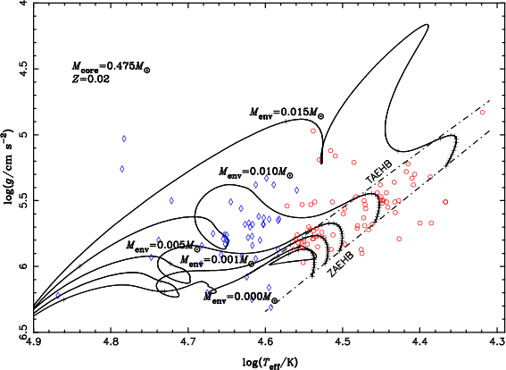 gravity, respectively. The commonly used evolution library of hot subdwarfs is that of Dorman et al. (1993), with masses from 0.4 to 0.5