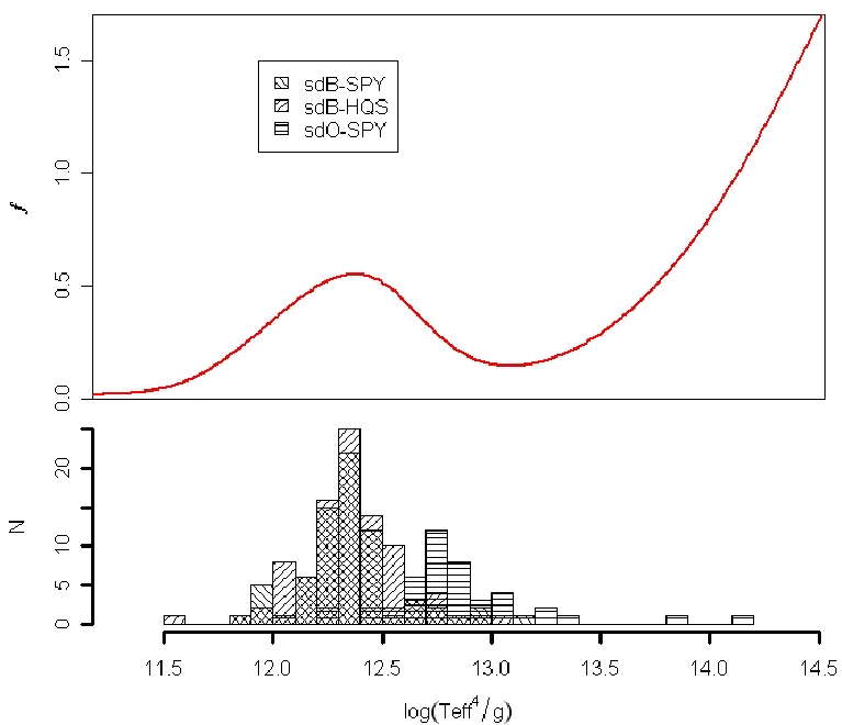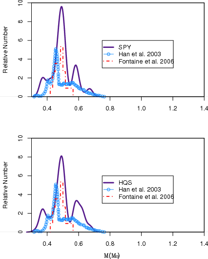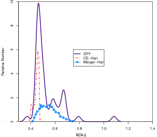 - In the paper of Han et al. (2003), the mass distribution are for both sdB and sdO stars. We seperated these objects, thus the distribution presented here is different from that of Han et al. (2003).