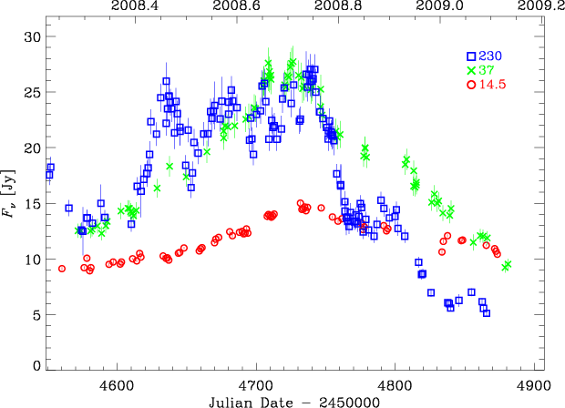 Figure 4: GASP light curves of 3C 454.3 from late March 2008 to February 2009 at 230 GHz (blue squares), 37 GHz (green crosses), and 14.5 GHz (red circles). |