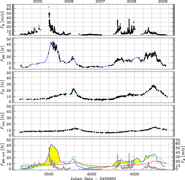 Figure 5: R-band flux-density (de-reddened) light curve ( top, mJy) and mm-cm light curves (Jy) at 230, 37, and 14.5 GHz from June 2004 to February 2009; in the bottom panel the optical data are reported together with the cubic spline interpolations through the 15-day binned data at 230 (blue line), 37 (green line), and 14.5 (red line) GHz; the regions where the 230 GHz spline exceeds the 37 GHz one are highlighted in yellow. |