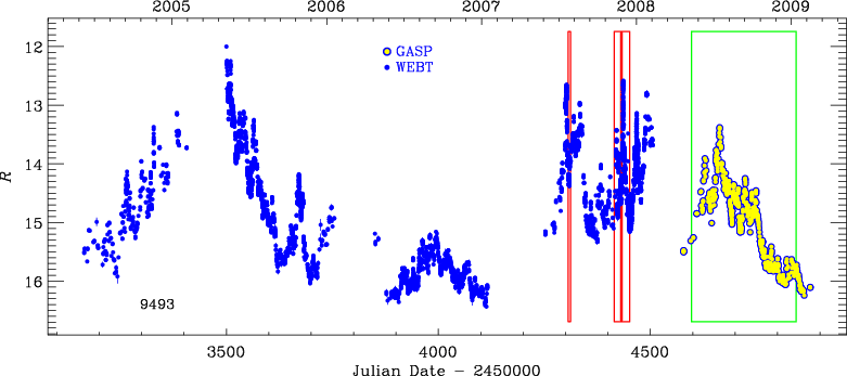 We calibrated the optical R-band magnitudes with respect to Stars 1-4 from the photometric sequence by Raiteri et al. (1998). Figure 1 shows the R-band data collected by the GASP in the 2008-2009 observing season (from April 2008 to February 2009; yellow-filled circles), together with WEBT data during the previous four seasons, since the big 2004-2005 outburst (blue dots; data from Villata et al. 2006; Raiteri et al. 2008a,2007; Villata et al. 2007; Raiteri et al. 2008b). In total, we assembled about 9500 data points. The participating GASP optical observatories in the 2008-2009 season were: Abastumani, Lulin, Armenzano, Crimean, Roque de los Muchachos (KVA), Belogradchik, San Pedro Martir, St. Petersburg, Kitt Peak (MDM), Teide (BRT), Sabadell, Talmassons, Calar Alto, L'Ampolla, New Mexico Skies, Valle d'Aosta, and Tuorla. Near-IR