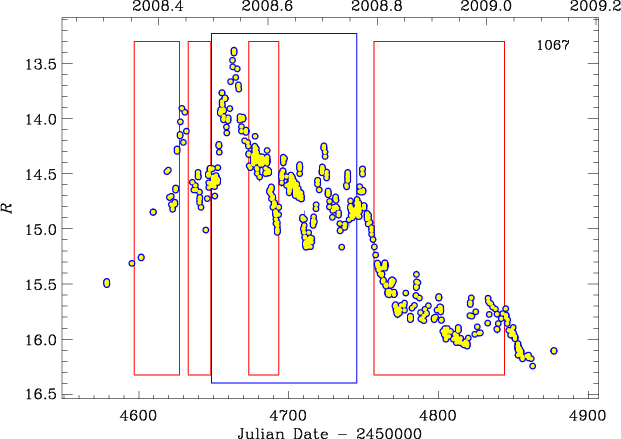 Figure 2: Enlargement of the last season of the R-band light curve shown in Fig. 1, during the GASP monitoring; see text for explanation of the red and blue boxes. |