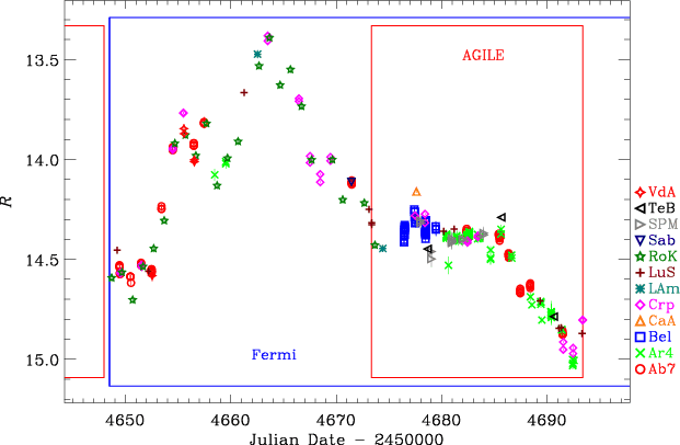 Figure 3: Further enlargement of the R-band light curve around the brightest phase of the 2008 outburst, well monitored also by Fermi and AGILE; different symbols indicate different observatories. |
