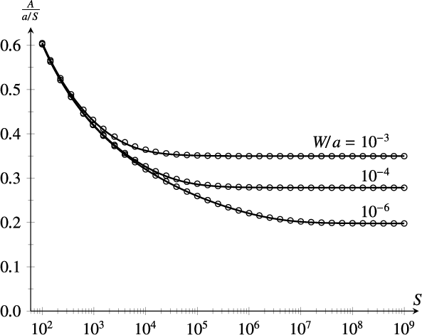 Since both S as well as a/W can safely be assumed to be larger than a few hundred, the relative corrections to A are below