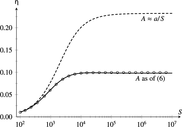 Figure 2: Recombination efficiency versus grain size, as obtained from KMC simulations (circles), from the master equation using Eq. (6) (solid line) and using the conventional approximation a/S (dashed line). |