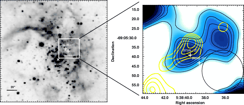 northwest of the center of the compact cluster R136, where the IR source IRSW-127, a young massive star, is very likely embedded. This source appears very strongly