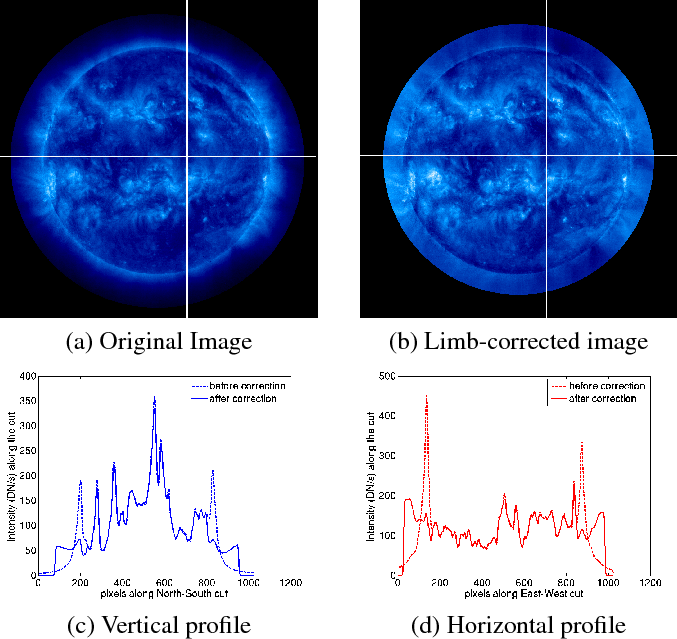 Figure 1: a) Original image. The vertical line and the horizontal line show the location of profile. b) Image with limb brightness enhancement corrected. c) The intensity along the vertical profile before and after correction. d) The intensity along the horizontal profile before and after correction. |