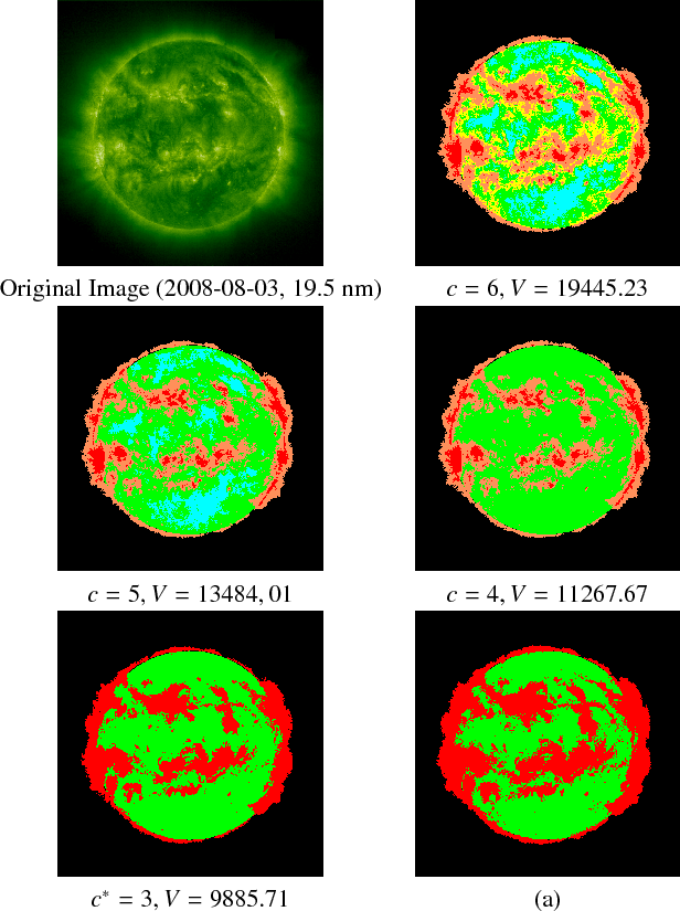 In this article, we chose p=2, and xj was set as the 2D-vector of pixel j whose components were the gray-level values of EIT 17.1 nm and 19.5 nm images, calibrated with eit_prep. The introduction of additional information (e.g. 28.4 nm image) is very easy through the concept of feature vector.