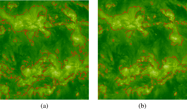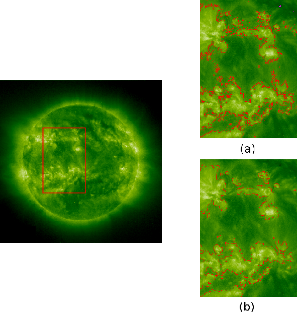 Previous works (Benkhalil et al. 2005; McAteer et al. 2005; Meunier 1999) showed that any segmentation of active regions based on thresholds only creates edges whose shape are very dependent on the value of the chosen threshold. In Barra et al. (2008), we proposed a first alternative to improve the AR edge shape by incorporating a spatial regularization term. Results however were sometimes of poor quality (Fig. 4a), because of the smooth transitions between AR and their surroundings, which generates fractal-shaped edges.