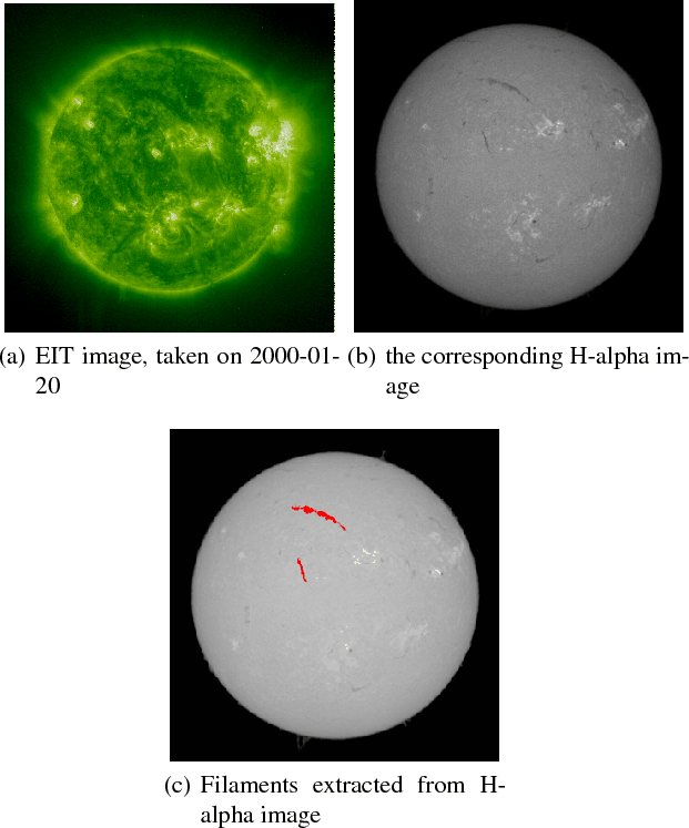 We propose here a non-real time solution for the accurate segmentation of CH, using a sensor data fusion process. Given a daytime t and a corresponding set of EIT images It (Fig. 5a), an H-alpha image from the Kanzelhoehe observatory taken at t (Fig. 5b) was used to accurately separate filaments from the CH map. Images were roughly spatially registered, using information extracted from their header, by first translating the center of the Sun, then by scaling with respect to the ratio of solar radius. The H-alpha image was then processed to extract filaments (Fig. 5c). Since filaments are dark, well contrasted and thin-elongated structures in this image, a simple method was proposed that allows a fast and reproducible segmentation. We first compute a mean curvature image, by assessing for each pixel (x,y) the trace of the local Hessian matrix H(x,y). A simple empirical threshold (set as 80% of the maximum mean curvature) then allows us to select points with high curvatures, and a search for connected components was begun to suppress isolated pixels. A region growing procedure was finally applied on the resulting image to highlight filaments, which were then reported on the CH fuzzy map. Finally, a region growing technique was applied on the CH fuzzy map to fully extract these components.
