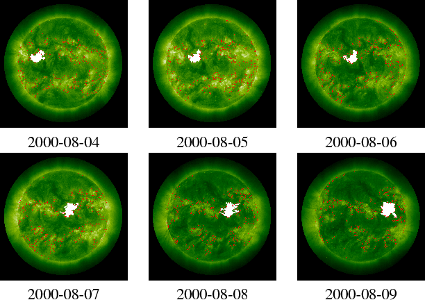 Figures 2 and 3 present results of this algorithm on a 19.5 nm image, taken on August 03, 2000 during maximal activity (denoted as I2 in the following) with
