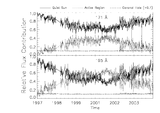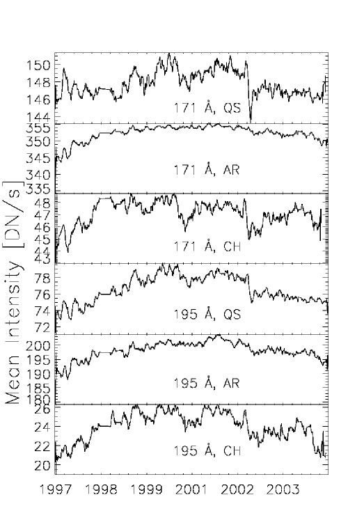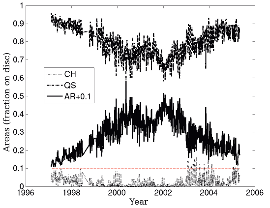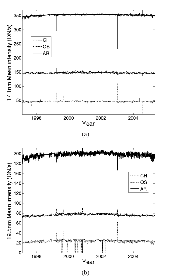 In Sect. 5, the new method is applied to the same dataset as in Barra et al. (2008). From the segmentation, we derived time series such as the area, mean intensity, and integrated intensity of AR, QS, and CH. An analysis of these time series is performed and compared to previous results from the literature.