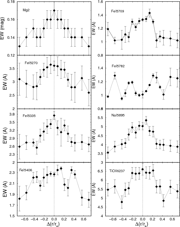 Some early-type galaxies have been shown to present systematic spatial variations on the line strength of the indices Mg 2 and Fe I, either from the centre to the external regions or limited to the central region (e.g. Gonzáles 1993; Carollo & Danziger 1994; Carollo et al. 1993; Davis et al. 1993; Fisher & Illingworth 1995; Fisher & Illingworth 1996).
