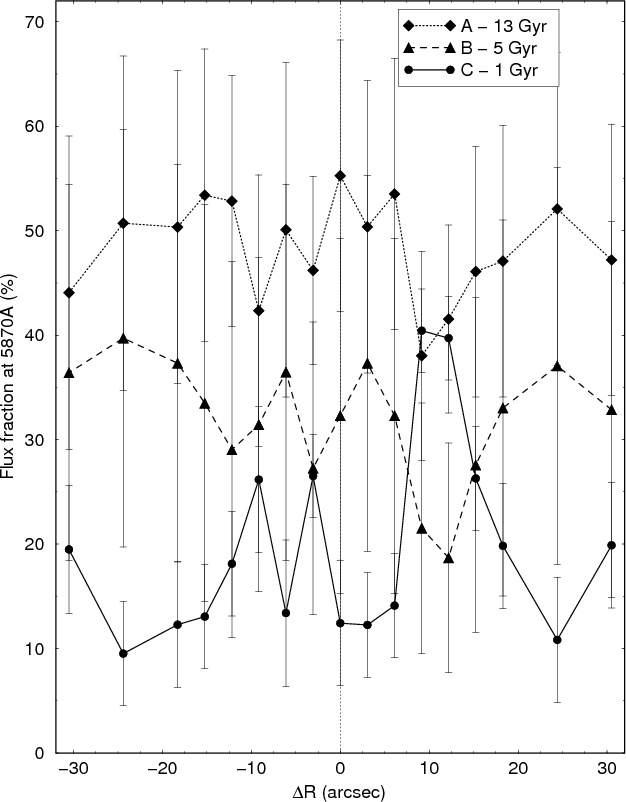 while the metallic feature profiles keep dropping, gas ionisation from old hot stars adds