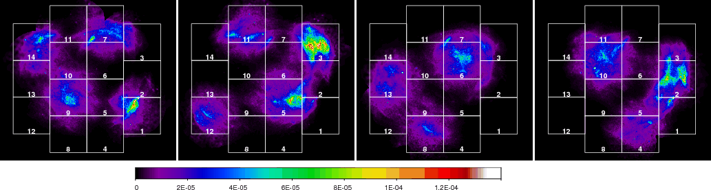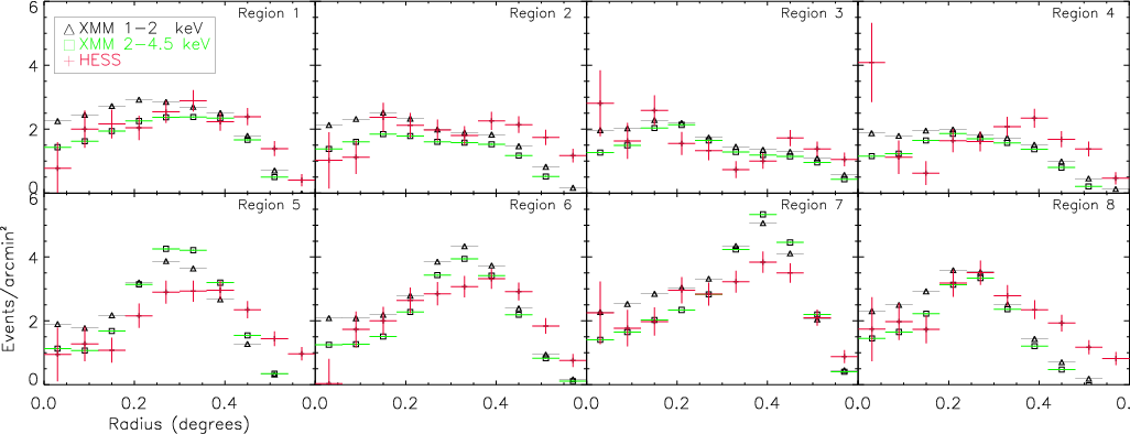 No evidence of spatial variations in the photon index from region to region (mean value of 2.09 and a standard deviation of 0.07) was found down