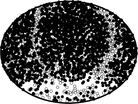 Figure 4: Sky distribution (equatorial coordinates, N up, E right) of the enlarged radio frame quasars. The filled symbols mark the sources for which an optical counterpart is found in at least one of the deep, dense source catalogs (B1.0, GSC2.3, DR5). The enlarged radio frame is formed, in order of priority of choice, by the ICRF-Ext2 (718 sources), the VCS6 (2684 sources), and the VLAC (59 sources). |