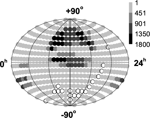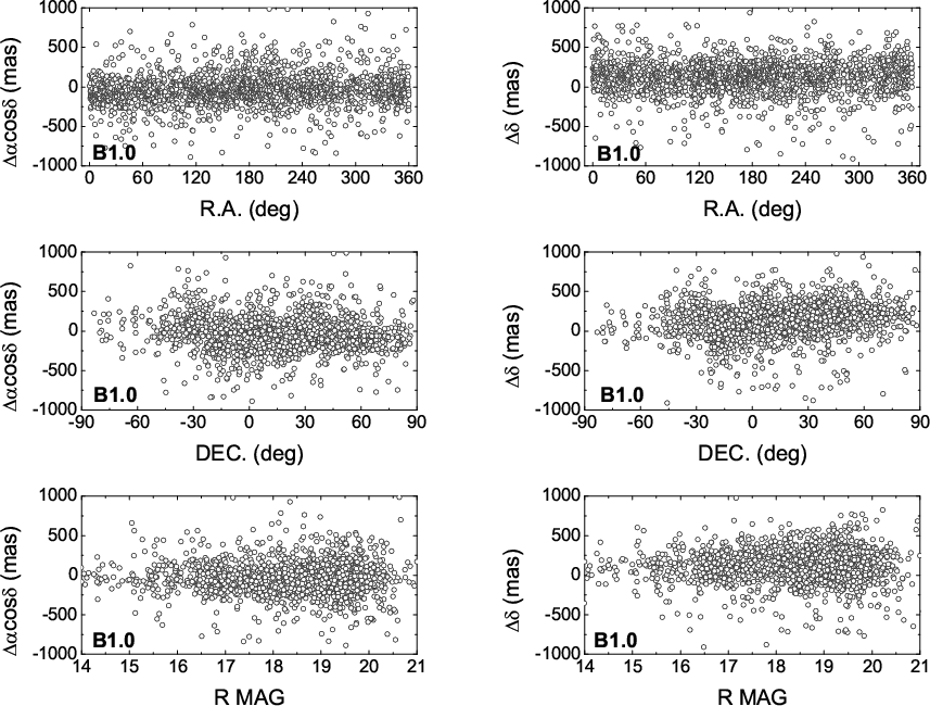The US Naval Observatory B1.0 catalog (Monet et al. 2003), hereafter B1.0, is the latest one of the series of all-sky ultra dense catalogs issued by the USNO. It brings positions and three colors magnitudes (Johnston B, R and I) at two epochs for 1 042 618 261 objects, up to about V=20. It results from scans of 7435 Schmidt plates taken for six sky surveys and calibrated using Tycho-2 stars (Hog et al. 2000). The nominal astrometric accuracy is 200 mas, but the individual objects position precision has a median value of 120 mas along each direction of measurement. Noticing that the quasars forming the LQRF seat at the B1.0 fainter end, where astrometric precision and accuracy is lower, the LQAC objects were searched for in the B1.0, and a neighborhood of stars, i.e., their position, proper motion, and magnitude, was also collected around the detected objects. Figure 2 presents the sky distribution and sky density of the 83 980 quasars recognized in the USNO B1.0.