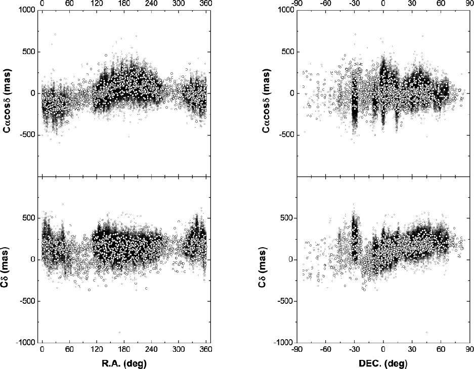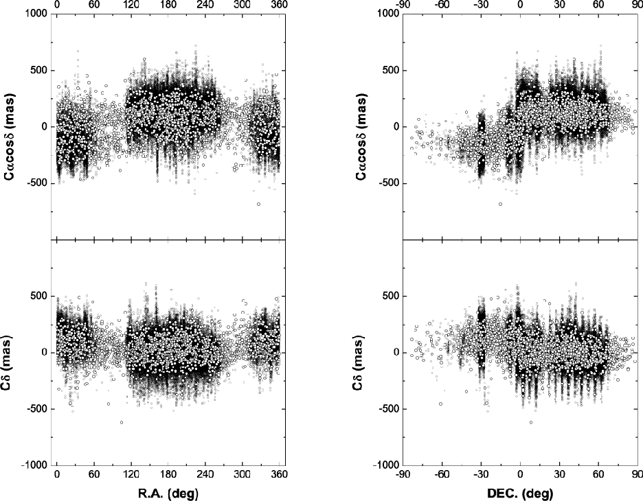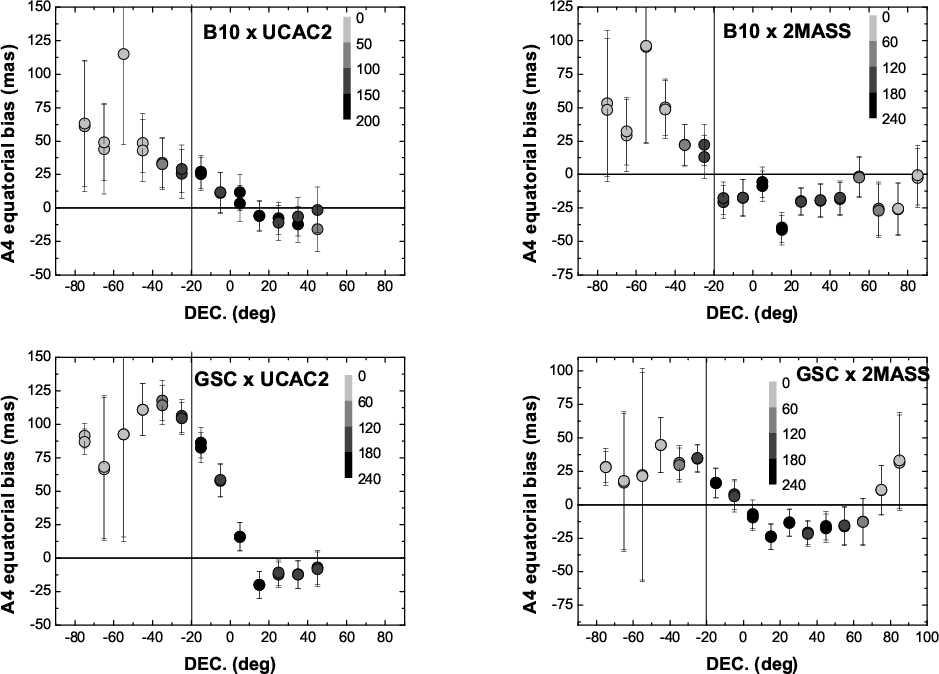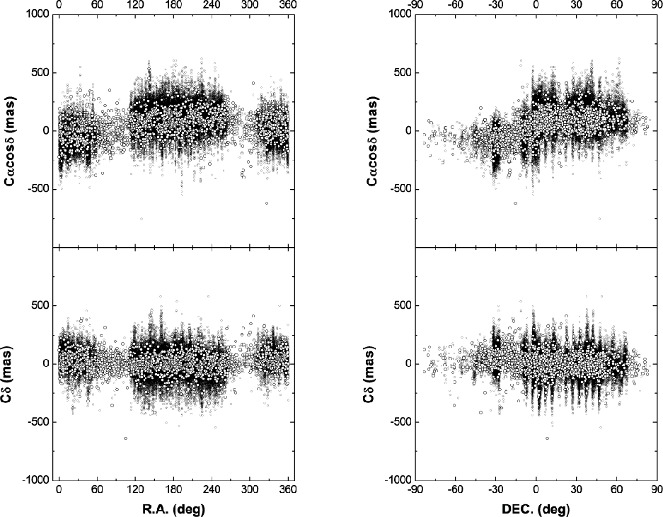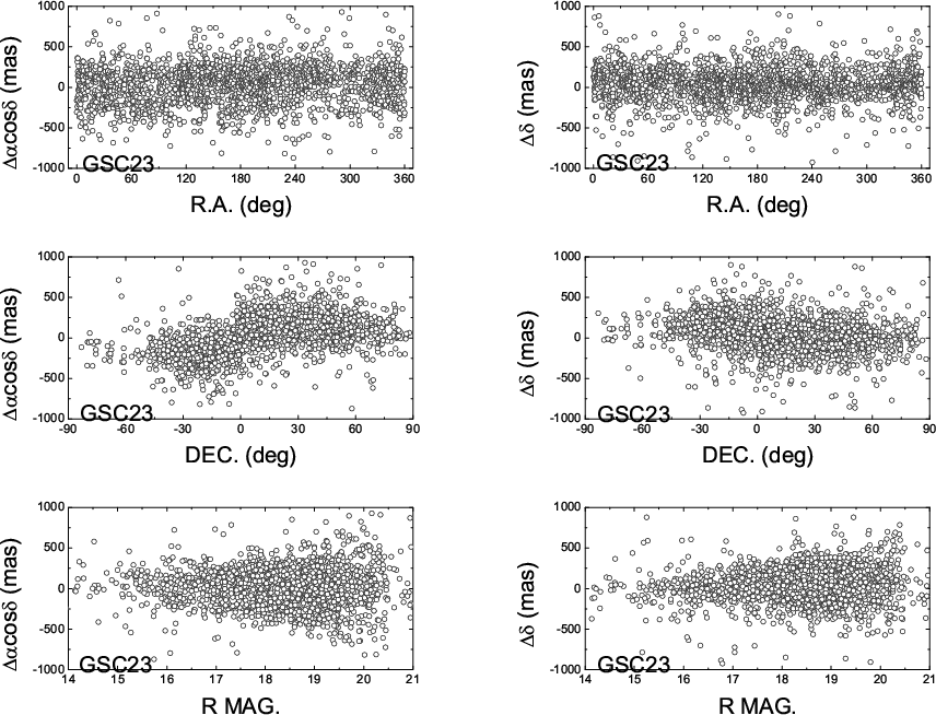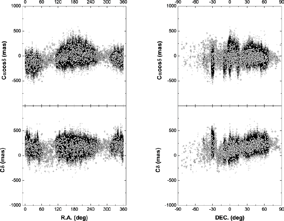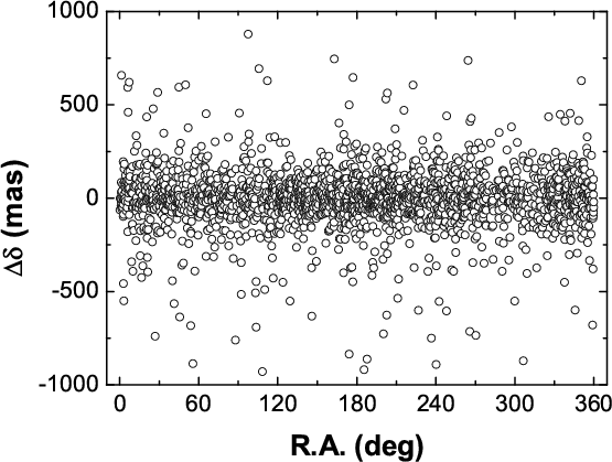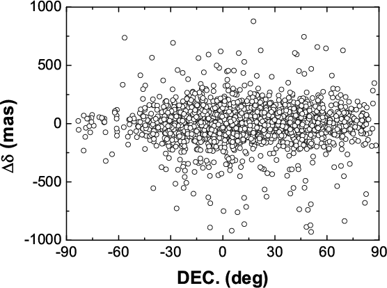 in some areas. The northern limit is a function of right ascension. The astrometry provided in the UCAC2 is on the Hipparcos system. Positions are given at the standard epoch of Julian date 2000.0. The UCAC2 supersedes the Tycho-2 catalog, having a stellar density that is over 20 times higher. It is used here as the preferred catalog to place the quasar positions collected from the catalogs described in the above subsections onto the Hipparcos system. Nevertheless, since the UCAC2 coverage does not include the entire sky, two additional stellar frames are complementary used and are presented below.