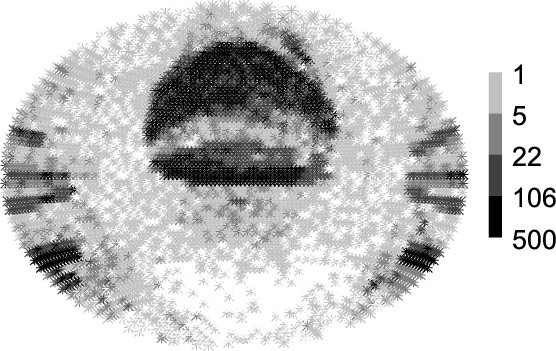 Sky distribution (equatorial coordinates, N up, E right) of the quasars found in the USNO B1.0 catalogs. Again, the highest density regions indicate the SDSS DR5 contribution.The scale represents the number of sources in regions of 9 sq |