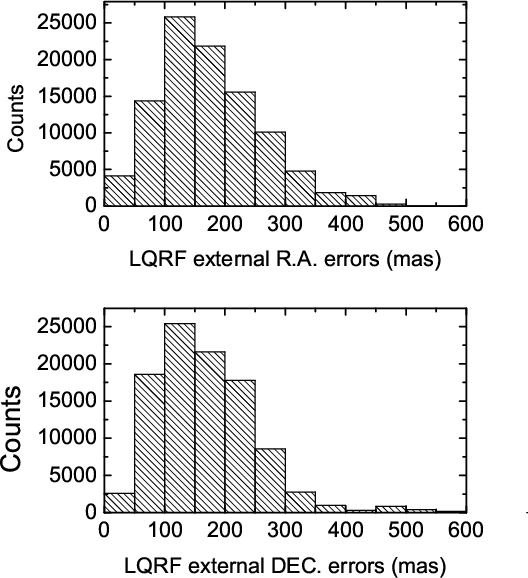 solutions. It is more realistic to derive the final error in the equatorial coordinates of each source from the external comparison of the LQRF position with the radio position. Since in the construction of the LQRF the three correction steps focused on the achievement of an homogeneous frame, this is done by taking the average of the LQRF minus radio positions for the 10 closest ERF sources around each quasar. As seen before, this implies a typical radius of 4.4around any LQRF quasar. Figure 18 presents the histograms of the errors in the coordinates. The distributions can be identified as Poisson distributions peaking at 139 mas in right ascension and at 130 mas in declination.