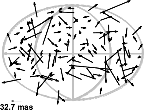 Vectorial distribution of the systematic deviations (north up, east right) of the LQRF to the ICRF within bins of 10 |