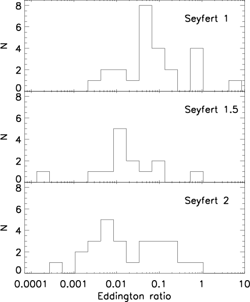 Because optical spectroscopy distinguishes between two main types of low-luminosity AGN, the broad-line Seyfert 1 and narrow-line Seyfert 2 objects, a similar distinction is apparent between unabsorbed sources with on-average softer X-ray spectra and the flatter spectra of absorbed sources. This has been noticed by Zdziarski et al. (1995), based on Ginga and CGRO/OSSE data and later confirmed e.g. by Gondek et al. (1996) using combined EXOSAT, Ginga, HEAO-1, and CGRO/OSSE spectra, and by Beckmann et al. (2006) using INTEGRAL IBIS/ISGRI data of AGN above 20 keV. A study of BeppoSAX PDS spectra of 45 Seyfert galaxies has come to a similar conclusion, although the spectra of Seyfert 2 appeared steeper when considering a possible cut-off in the spectra of Seyfert 1 galaxies (Deluit & Courvoisier 2003). X-ray data already show that most, but not all, AGN unabsorbed in the X-rays are Seyfert 1 type, and most, but not all, AGN that are absorbed belong to the Seyfert 2 group (e.g. Awaki et al. 1991).