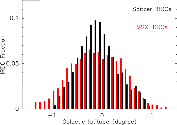 The first large survey of IRDCs was undertaken by Simon et al. (2006a) using the mid-infrared data of the MSX satellite. In total, Simon et al. detected more than 10 000 IRDCs, with sizes larger than (36