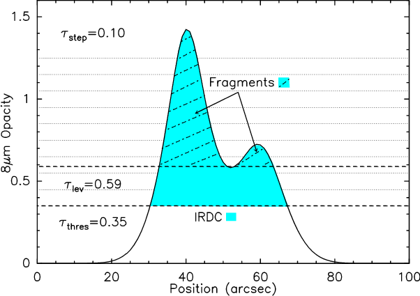 Illustration of our extraction method. This figure shows the opacity profile of a typical IRDC. The bottom dashed line shows the opacity threshold beneath which structures are ignored. The dotted lines show the different slices through the cloud, every slice being separated by