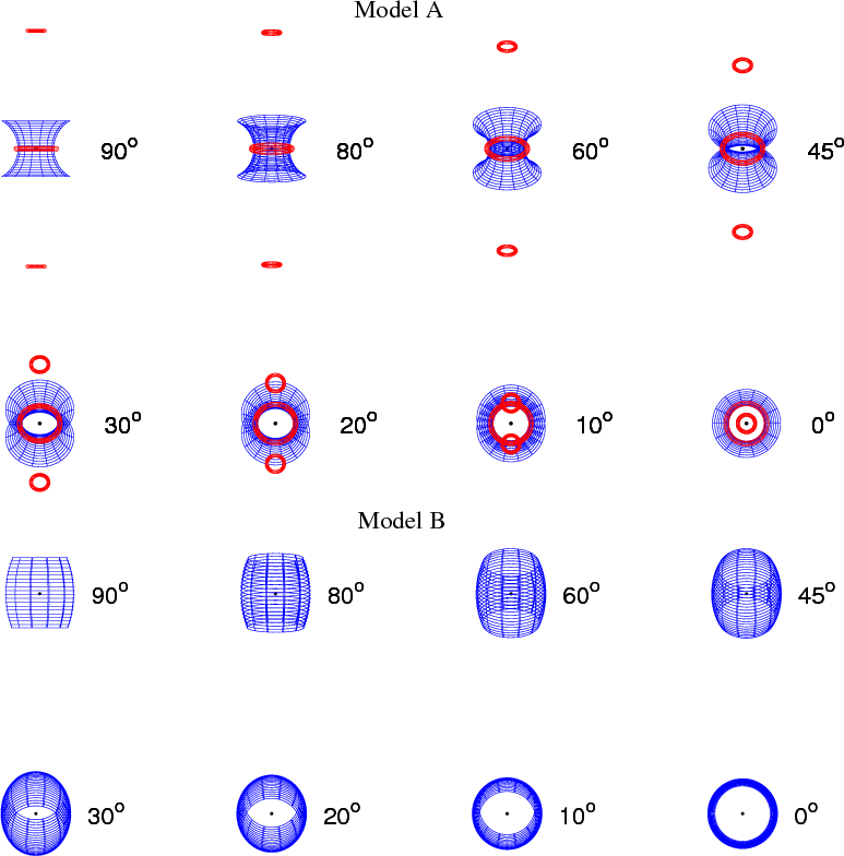 Model A is a simple bipolar adapated from Pollacco & Bell (1997). Model B is a rudimentary adaptation of the Frank et al. (1993) model. The inclination angle of the nebulae range from 90