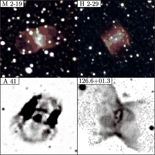 Even without kinematic information there is still room for qualitative classification within the framework of geometric bipolar models for post-CE PNe. Pollacco & Bell (1997) constructed such a model and made favourable comparisons with A 41, A 46, A 63 and A 65 suggesting they are bipolar nebulae. Similarly, De Marco (2009) considered inclination effects without the assistance of models to estimate as much as 70% of post-CE PNe could indeed be bipolar. This estimate is however disputable in that it was heavily biased by a small sample and in some cases the highest quality images available in the literature were not used (e.g. A 65, see later). A detailed reappraisal of a large sample of post-CE PNe is therefore required to substantiate the suspected high bipolar fractions from recent observations and to compare them with current theoretical expectations.