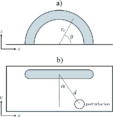 Cartoon showing a view of the coronal loop a) from the side and b) from the top. The pressure pulse is located a constant distance d away from the apex, at a height equal to the loop major radius
