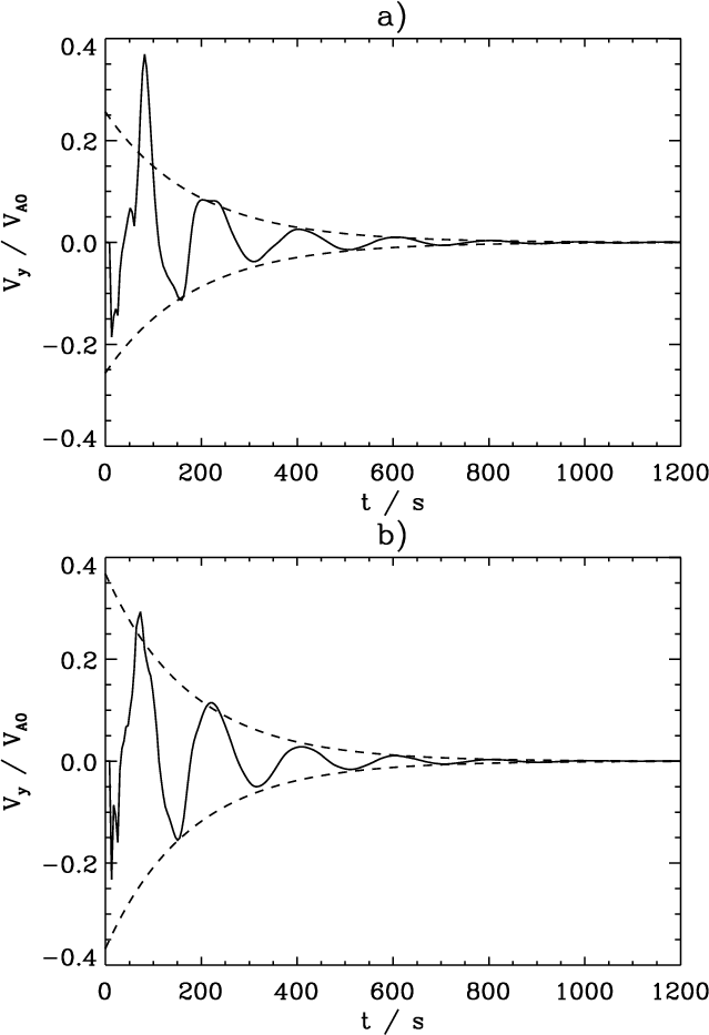 Figure 5: Transverse velocity signal vy (normalised to the Alfvén speed at the loop apex) measured at the loop apex for an attack angle of a) 0 degrees and b) 30 degrees. The dashed lines show fits to an exponential decay. |