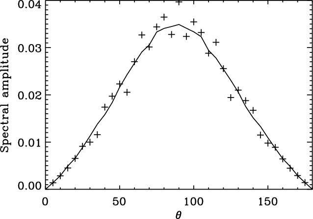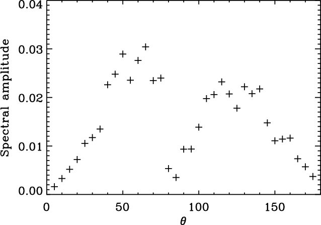 If the excited transverse velocity signal is indeed the global kink mode for the loop, the amplitude of the oscillation is expected to be largest at the loop apex and zero at both footpoints. Figure 7 shows the spectral amplitude as a function of the angle around the loop ,