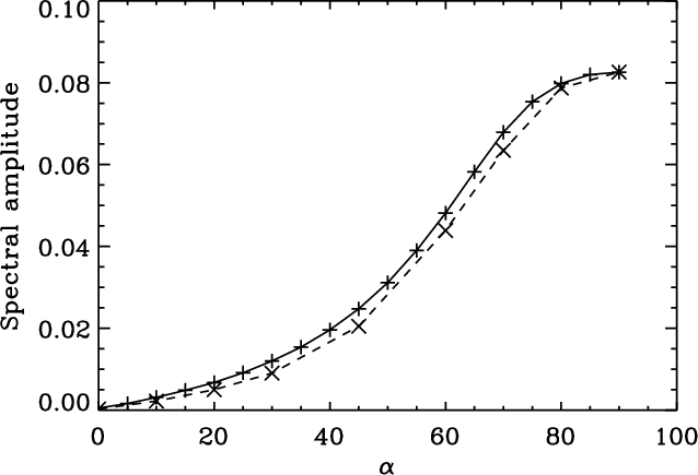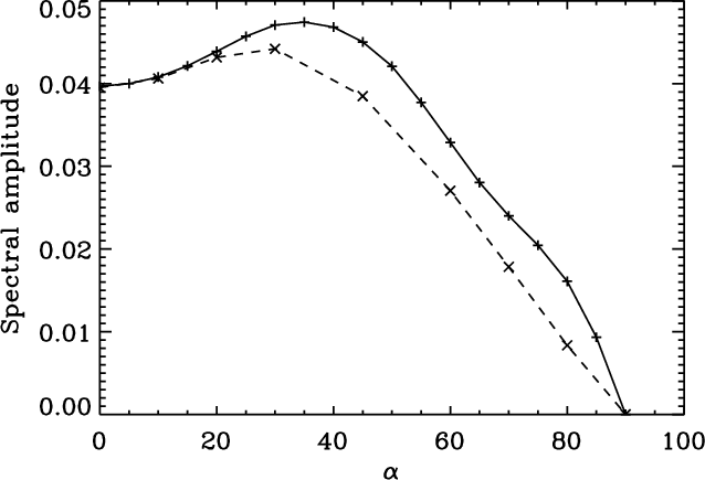 for a range of attack angles, we take the periodogram of the transverse velocity displacement at the loop apex and determine the amplitude of the peak in the periodogram. Figure 8 shows this maximum spectral amplitude, measured at the loop apex, as a function of the attack angle. For small values of attack angle, the transverse kink mode is excited efficiently, leading to relatively high spectral amplitudes. As expected, the excitation of the transverse perturbation becomes less efficient for larger values of the attack angle. For