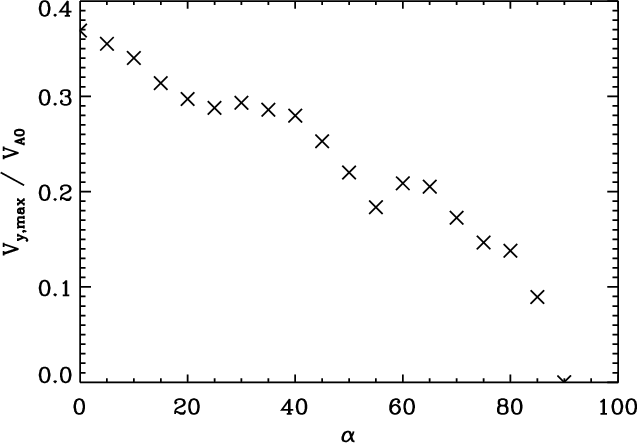 degrees (see Fig. 5a) remains quasi-period for a slightly longer time. The combination of the relatively low signal quality (see below) and the ``cleaner'' transverse velocity for an attack angle of 30 degrees leads to a slightly higher peak in the corresponding periodogram. To show that this is indeed the case, the actual maximum amplitude of the transverse velocity perturbation at the loop apex is plotted in Fig. 9, again as a function of the attack angle. The largest amplitude perturbation does indeed occur for zero attack angle, with the transverse perturbation decreasing steadily for increasing values of