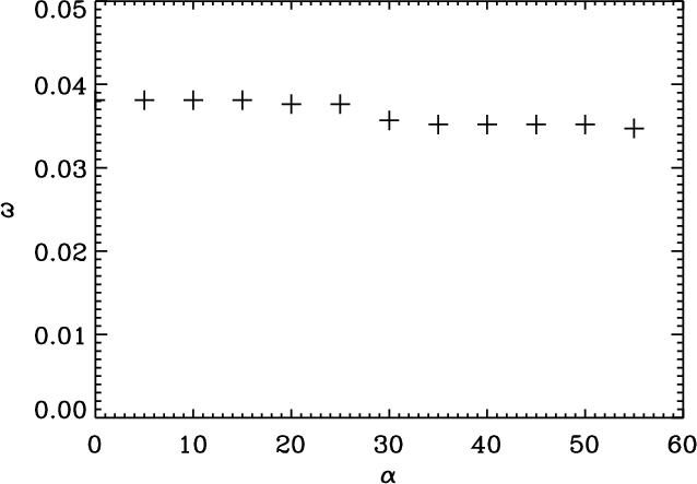 So far, we have looked at both the amplitude of the transverse velocity displacement at the loop apex and the corresponding spectral amplitude derived from the periodogram. Figure 10 shows the (cyclic) frequency of oscillation as a function of the attack angle .