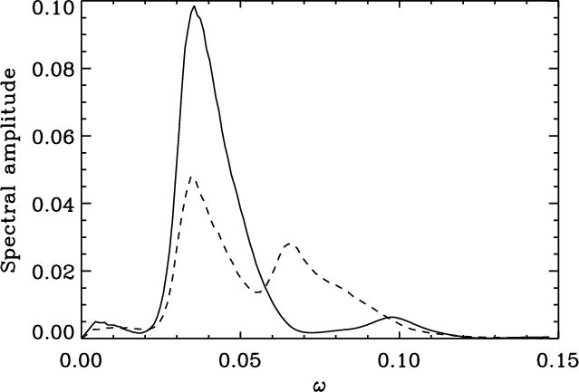 Figure 6 shows the periodogram of the transverse velocity signal shown in Fig. 5(a). The spectral amplitude shows a single peak frequency corresponding to the kink mode. The peak is rather broad, due to a combination of the quasi-periodic nature of the velocity signal, as well as its relatively short duration. The maximum of this peak corresponds to a period of oscillation of 165 s. Wavelet analysis confirmed that this period remains roughly constant for the duration of the simulation. The dotted line in Fig. 6 corresponds to the velocity signal located outside the loop at y=4a. It has been normalised to half the amplitude of the solid line for clarity, and it shows that the kink mode eigenfunction has tails that extend into the external medium.