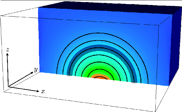 Figure 1: 3D Numerical domain showing the density-loaded model coronal loop (shaded region) as well as a few representative magnetic field lines outlining the arcade structure. The colour gradient in the background represents the magnetic field strength. |