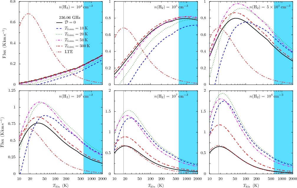 cm-3). The calculated line fluxes are in good agreement with observations and confirm the chemical model results (Sect. 3.3.4).