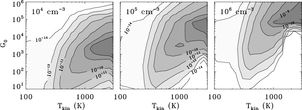 Contour levels for the CO+ fractional abundances for hydrogen densities between 104 cm-3 and 106 cm-3. The assumed optical depth is